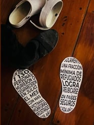 Una parte de la muestra que intenta comunicar esta conexión entre las historias es seguir los pasos de estas personas, representados por impresiones en forma de huellas regadas en el piso, que contienen datos sobre la migración, como la fracción mínima de refugiados que logran reubicarse en países seguros cada año, o las 7.130 víctimas migratorias registradas en julio de 2024.