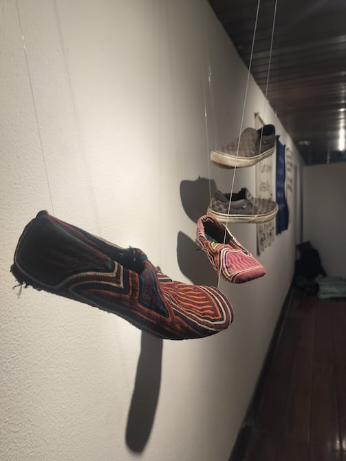 Los zapatos desgastados de los migrantes, además, cuelgan del techo, casi con la intención de obstruir el paso a los visitantes, recordándoles del camino que peligroso que toman los que deciden dejar sus barrios o países de origen.
