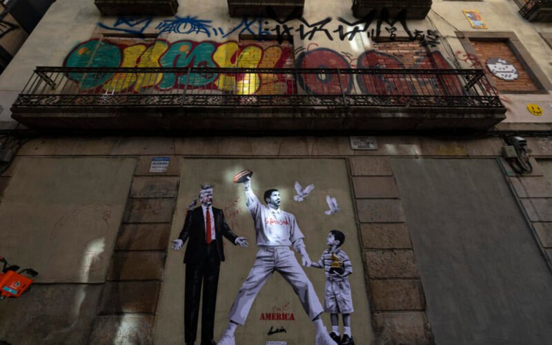 Un grafiti del artista Alberto León en el centro de Barcelona, en el noreste de España, reivindica la paz frente al presidente estadounidense, Donald Trump, con una imagen del cantante puertorriqueño Bad Bunny en su espectáculo de la Super Bowl, de la mano de un niño detenido por la policía migratoria.
